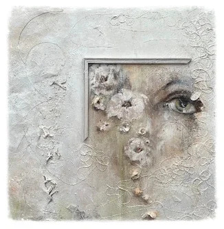 An eye, quiet and contemplative, gazes through a veil of gentle hues and faded contours.