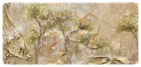 Delicate trees emerge from a textured dreamscape, their branches gently swaying in a muted breeze of ochre and gold. Layers of fabric and earth-toned plaster embrace the canvas like time-worn memories, softly cradling nature’s fragile beauty. In this ethereal grove, silence speaks — and the trees, with their shimmering leaves, whisper secrets only the soul can hear. A timeless dance between texture and tenderness, where nature meets the abstract heart of emotion.